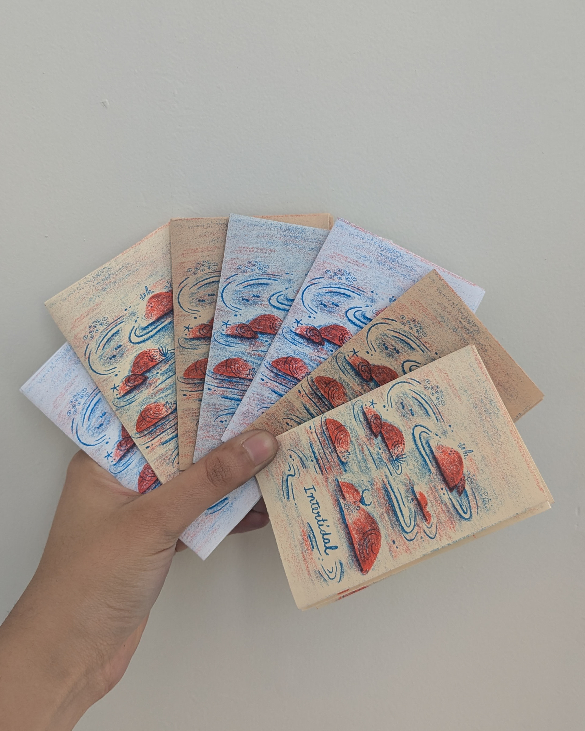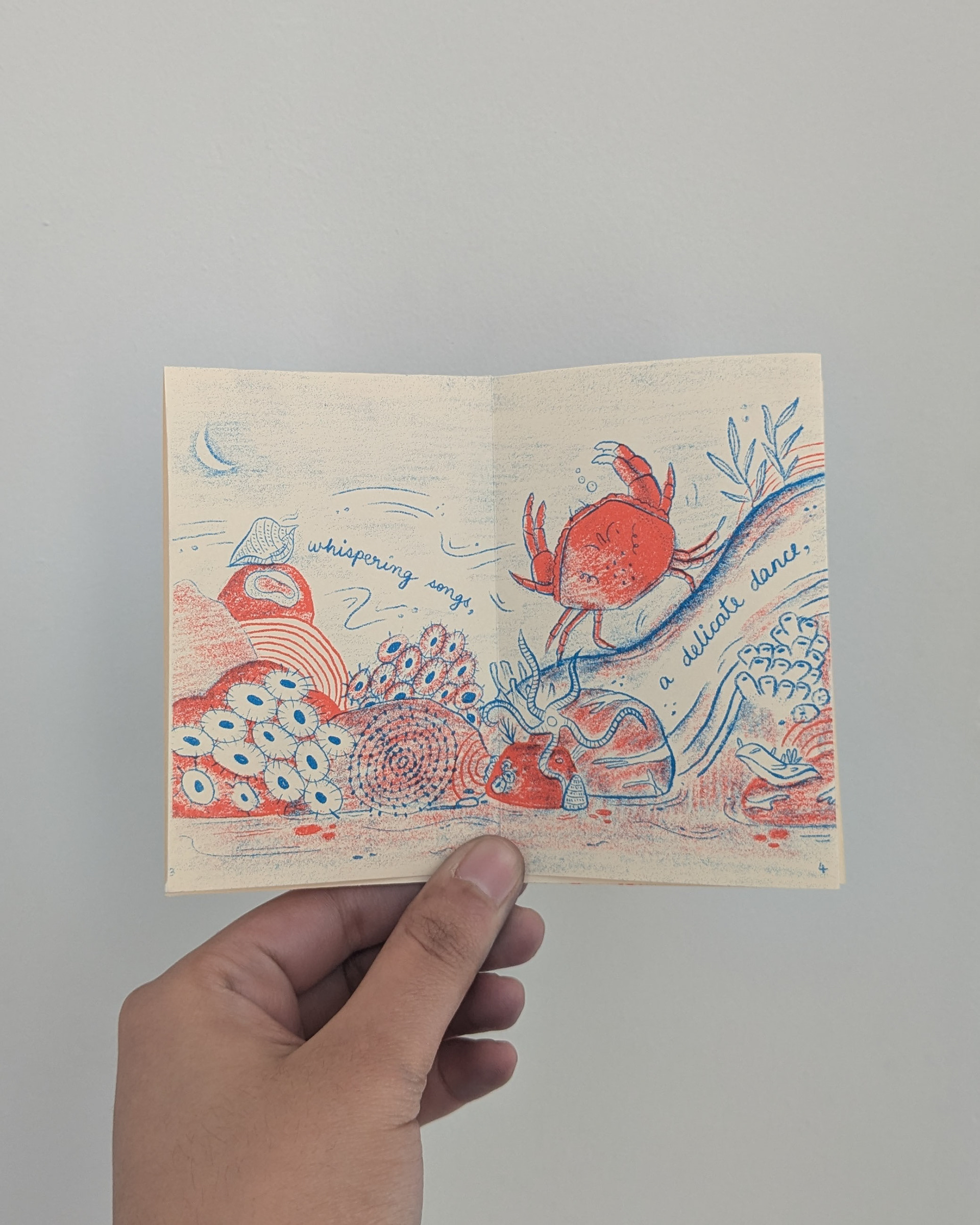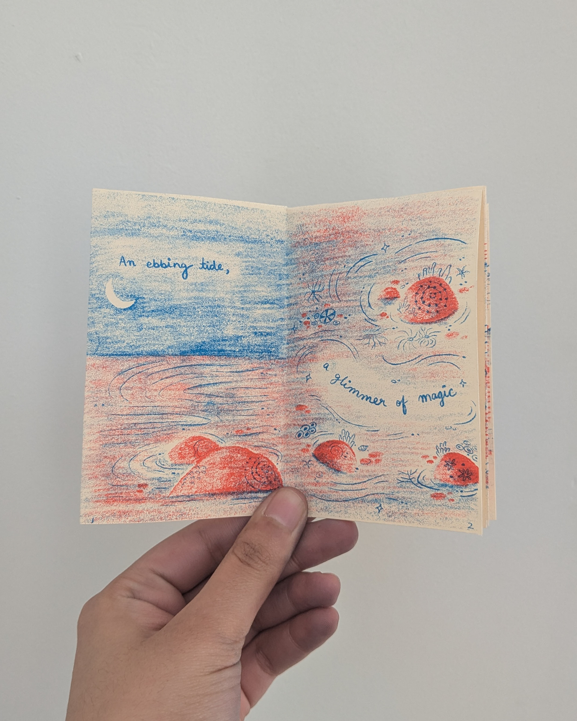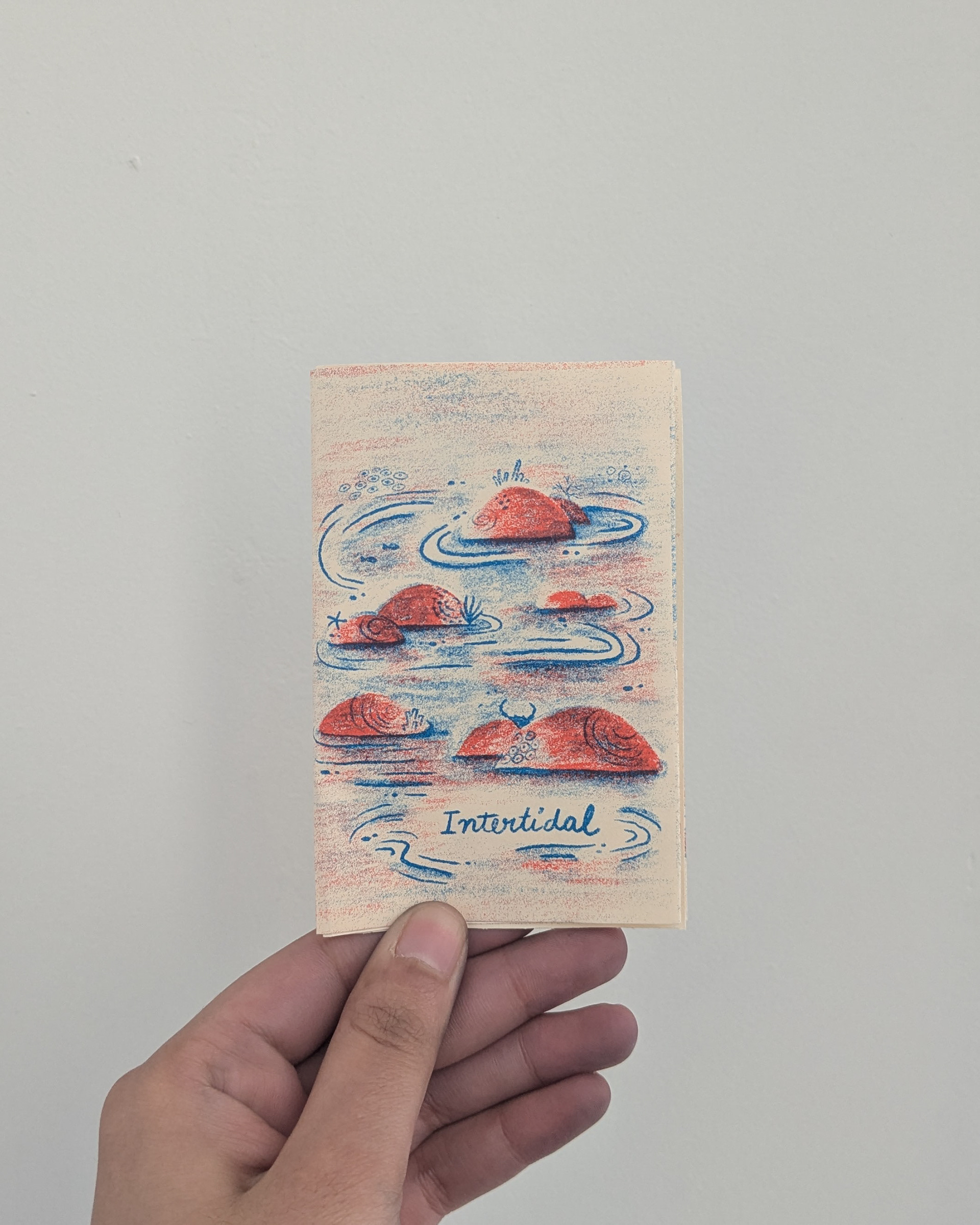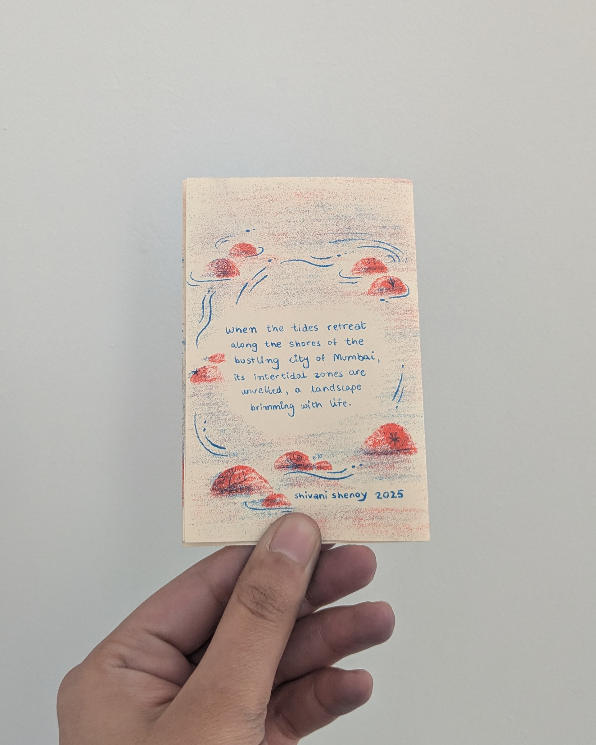 When the tides retreat along the shores of the bustling city of Mumbai, its inter tidal zones are unveiled, a landscape brimming with life. This two-color risograph zine is a celebration of the glimmer of magic that