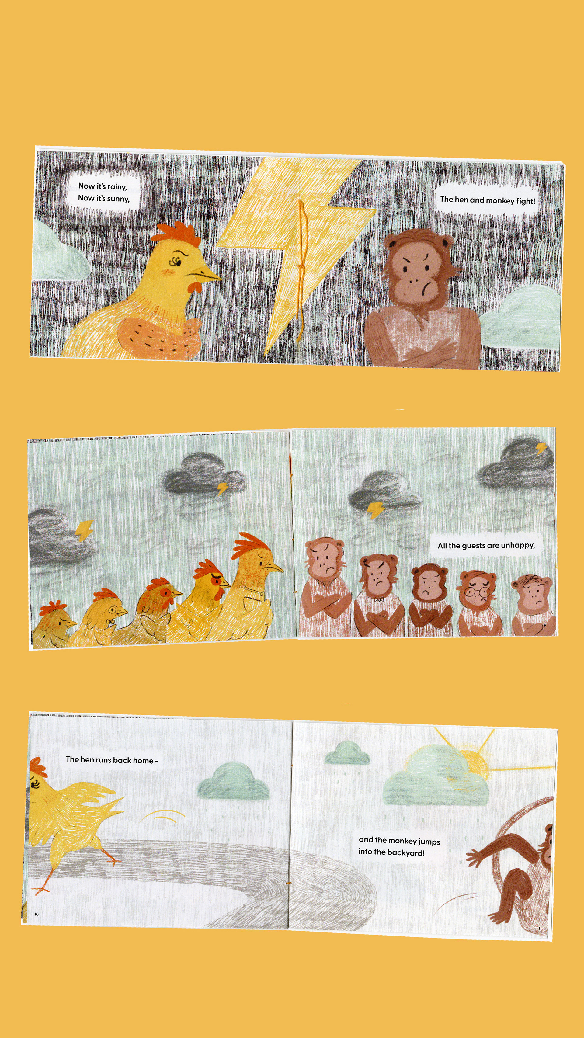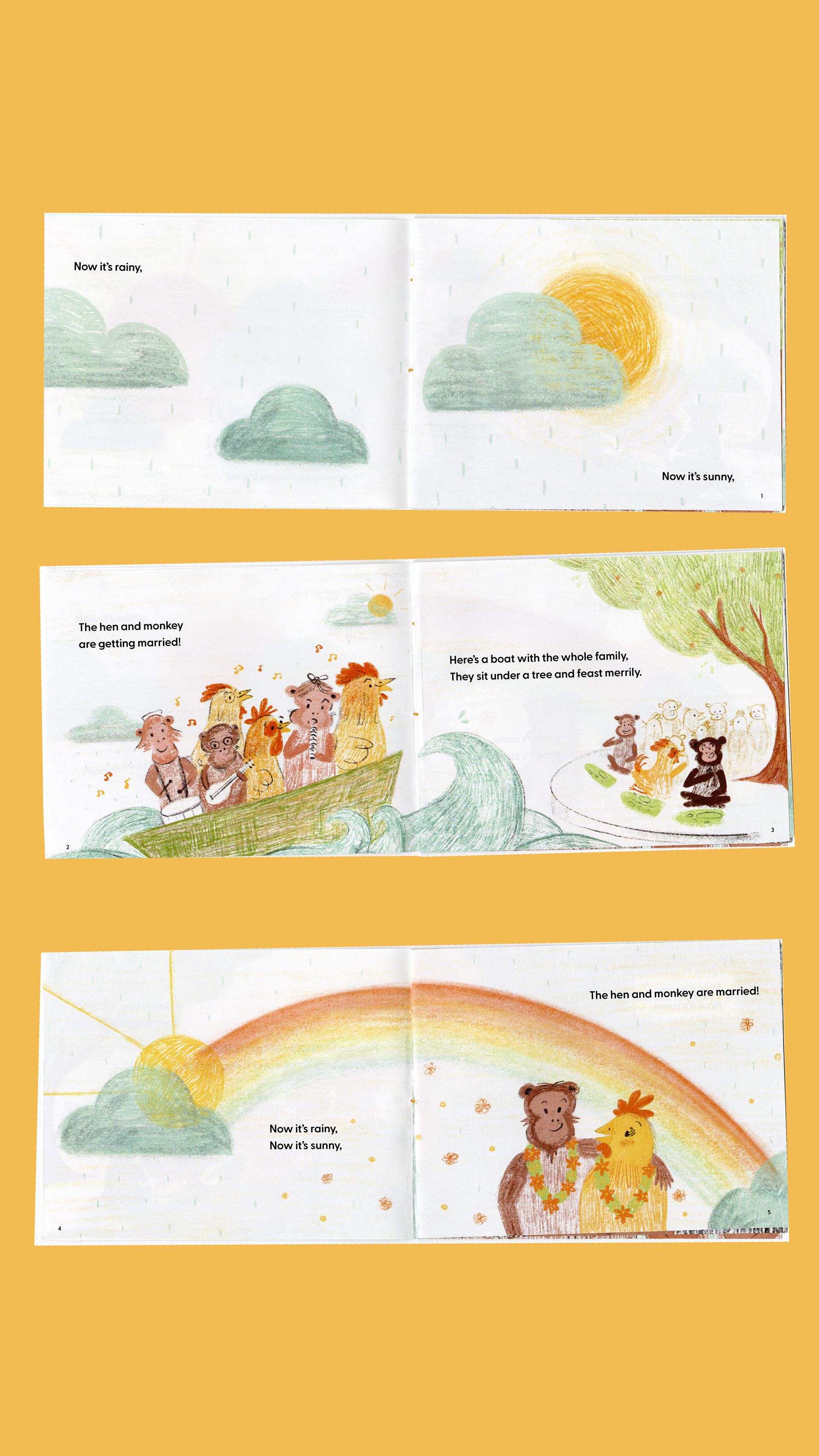 In several cultures, sun-showers are associated with strange myths. This rhyme, from the Konkani-speaking community of South India, tells the story of the hen and monkey’s sun-shower wedding.