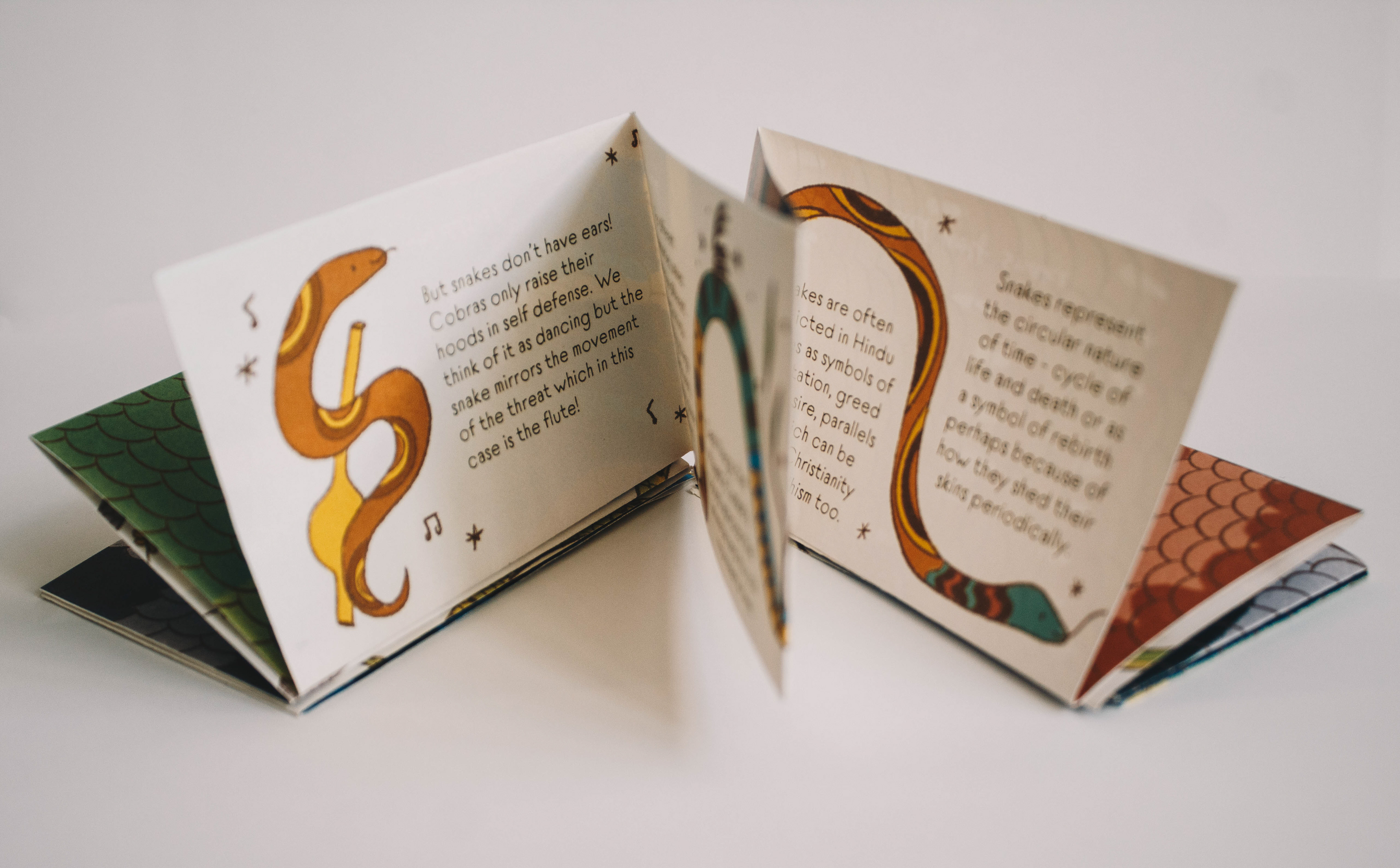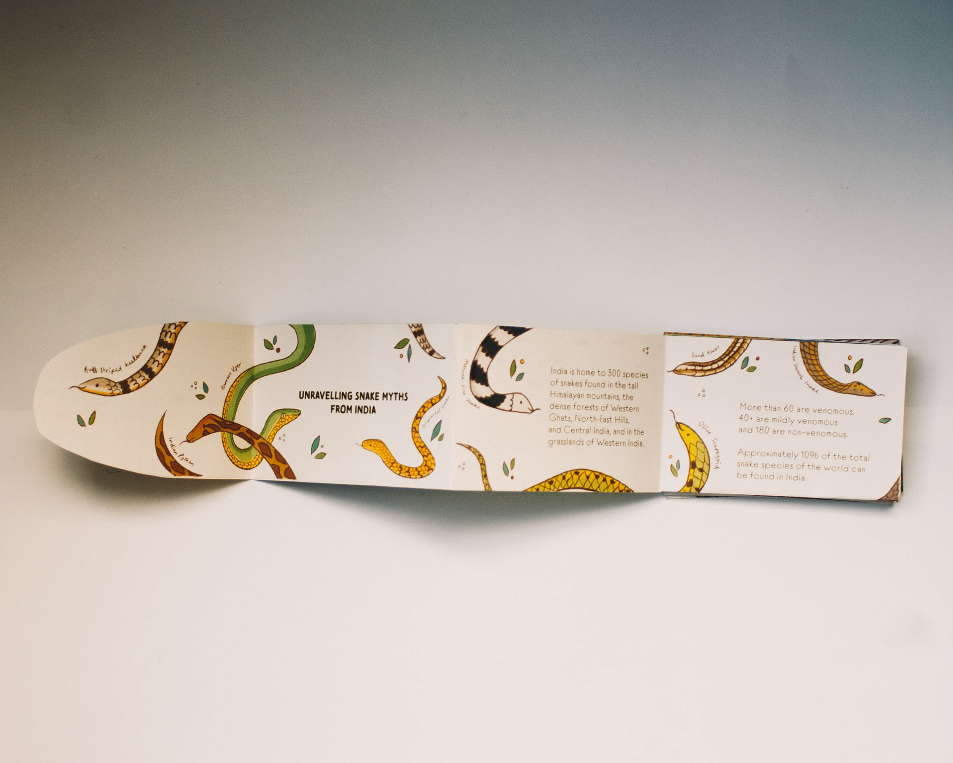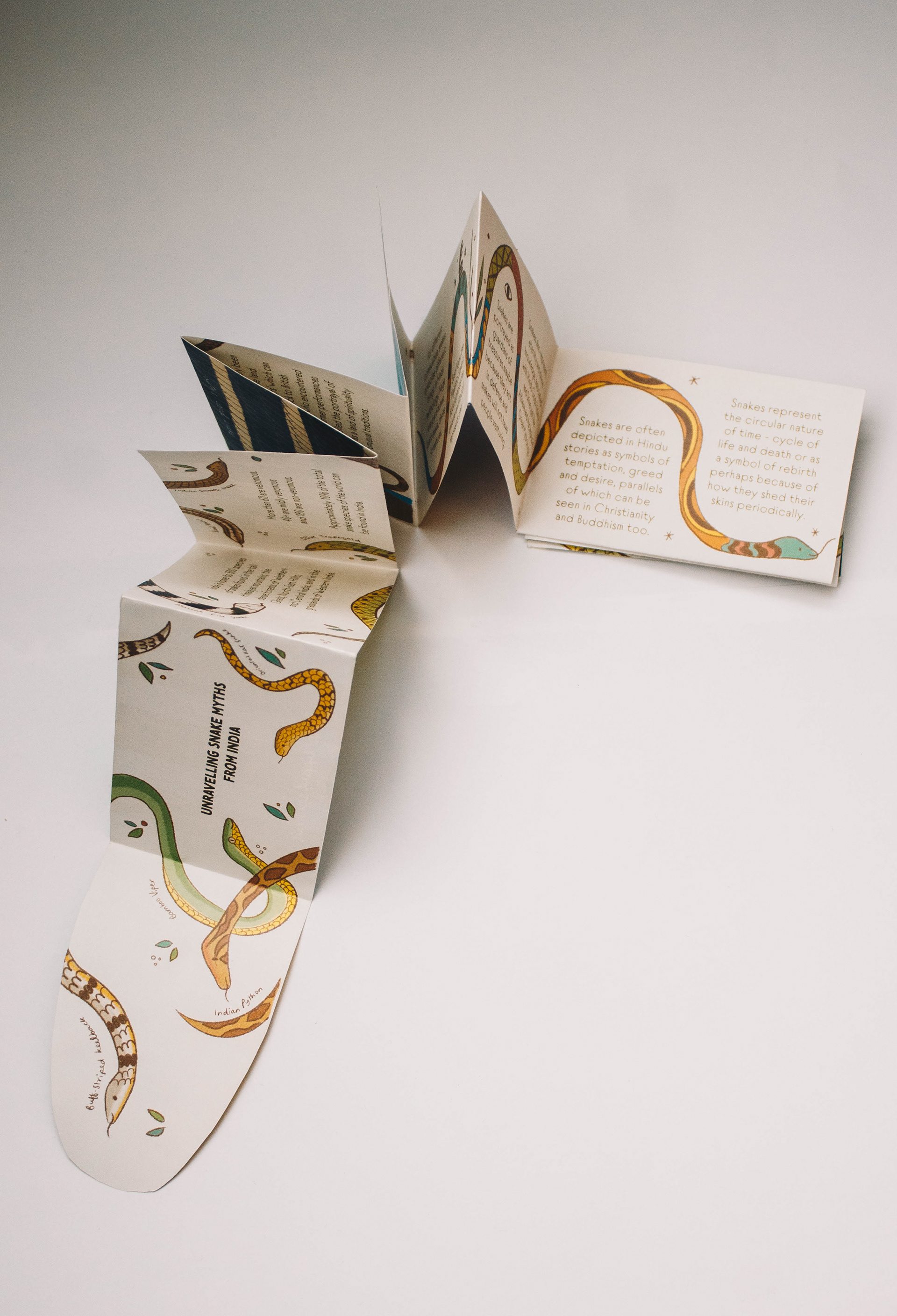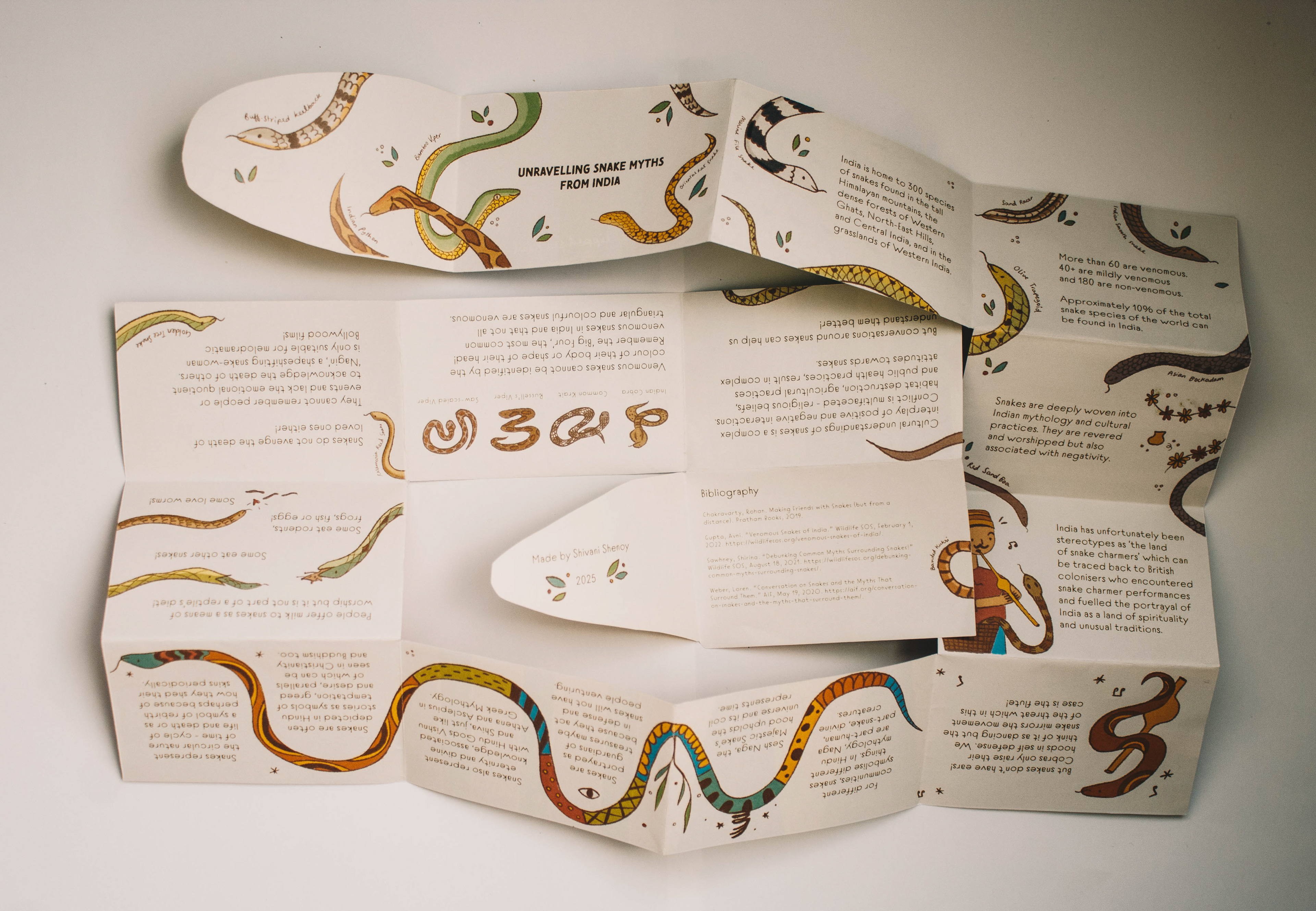 Designed as an accordion zine which debunks my ths associated with snakes, all while unravelling like a snake! A pattern- quilt of snake scales at the back of the zine showcases the diversity of Indian snake species.