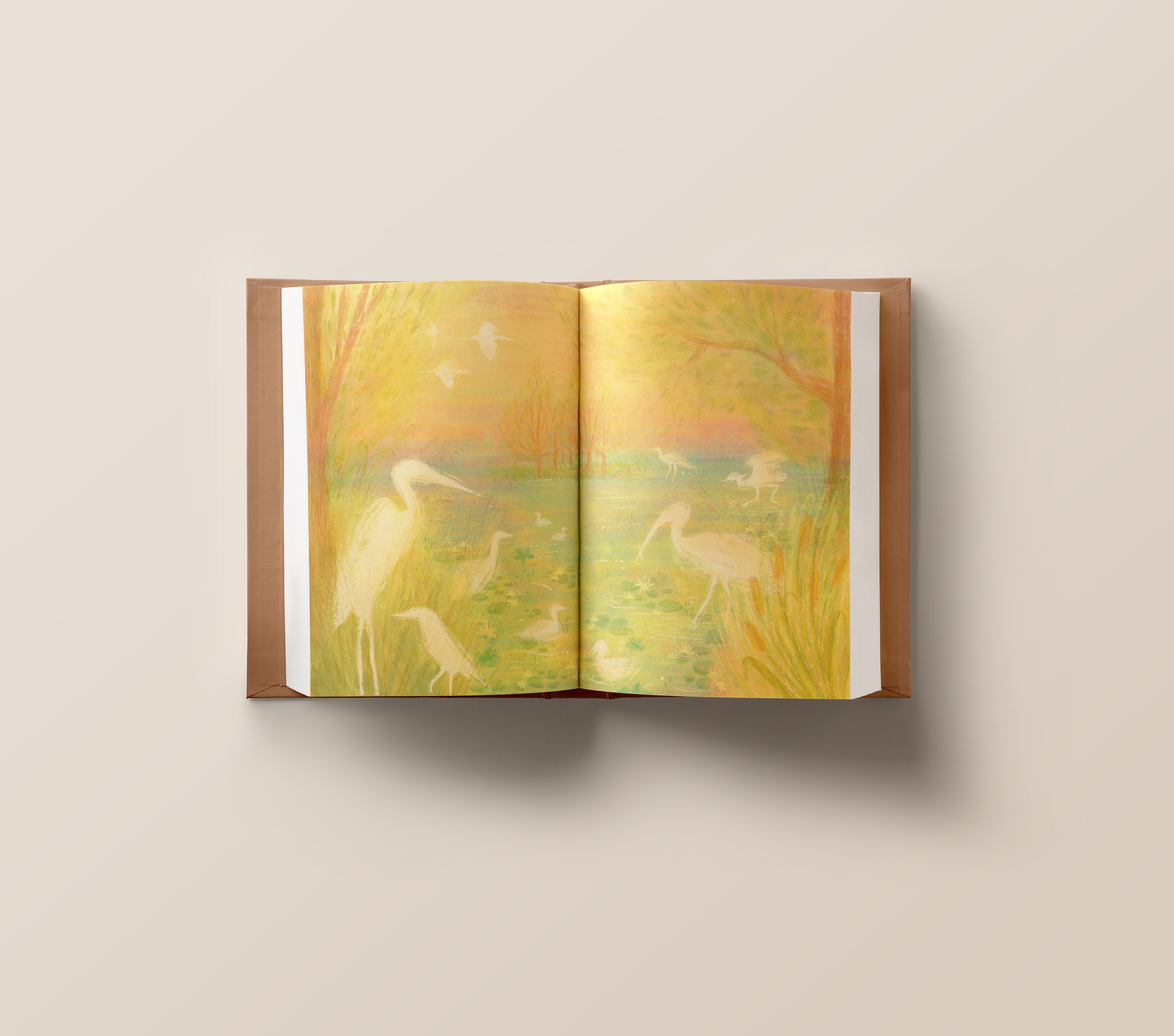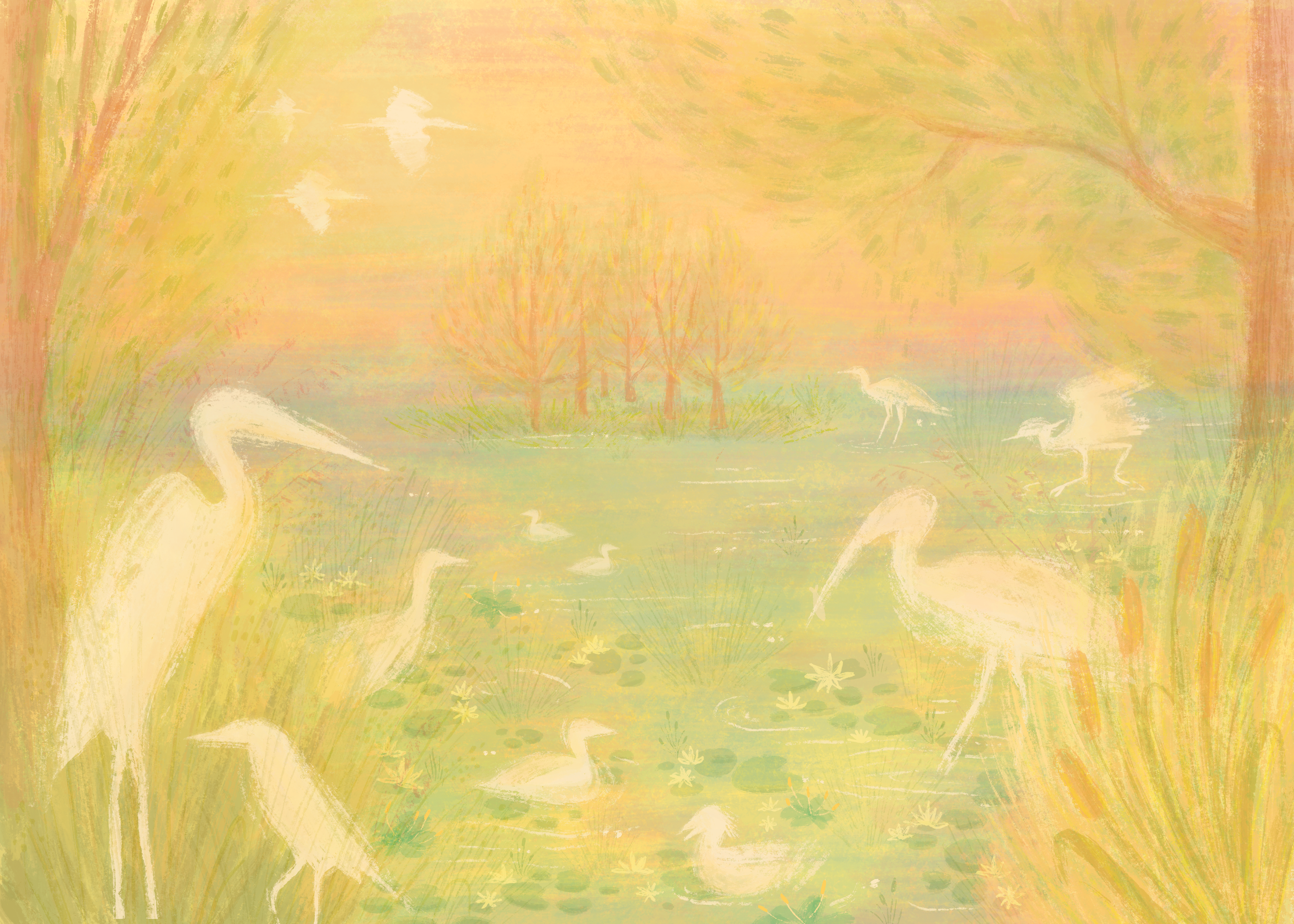 An illustrated spread and cover design inspired by 'The Ponds' from Mary Oliver's book, 'Upstream'. The essay details the birds that visit the pond across seasons. Her words are a quiet and beautiful description of simple observations of the natural world, which might often be overlooked. Created as part of a class assignment.